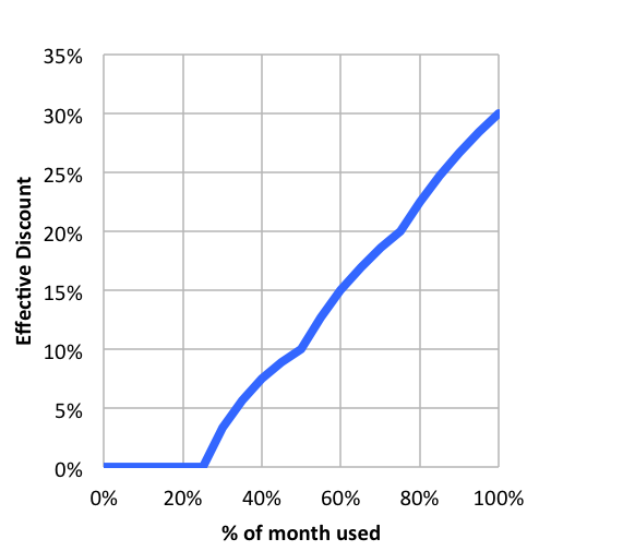 The following graph shows an example scenario where your effective sustained use discount increases with use, up to a maximum of 30% by the end of the month:
