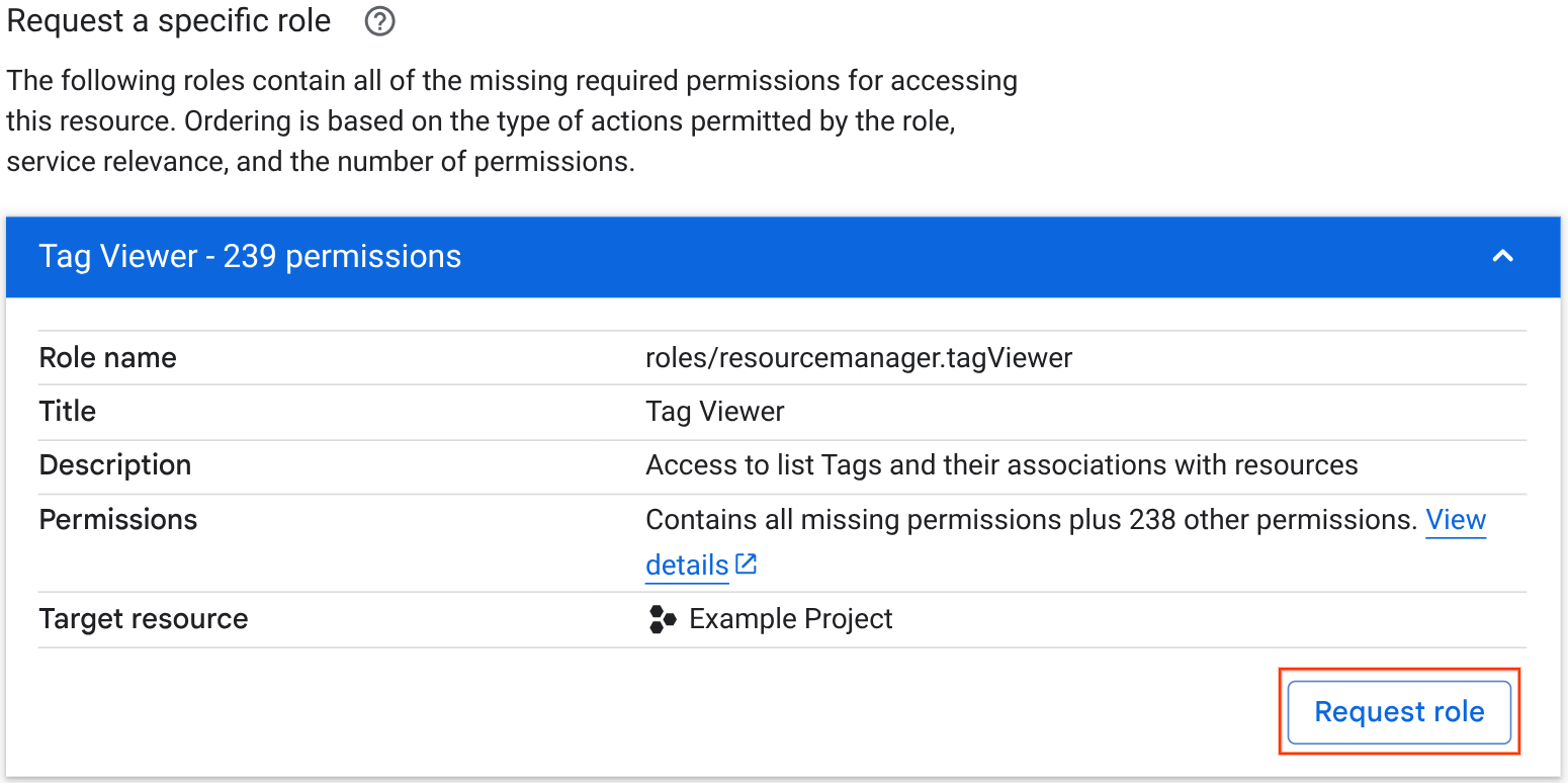 Sehen Sie sich im Bereich Eine bestimmte Rolle anfordern die Liste der empfohlenen Rollen an und wählen Sie die gewünschte Rolle aus. Wenn Sie auf die Rollen klicken, werden weitere Details dazu angezeigt. Dieser Bereich ist nur sichtbar, wenn der Berechtigungsfehler auf eine Zulassungsrichtlinie zurückzuführen ist.