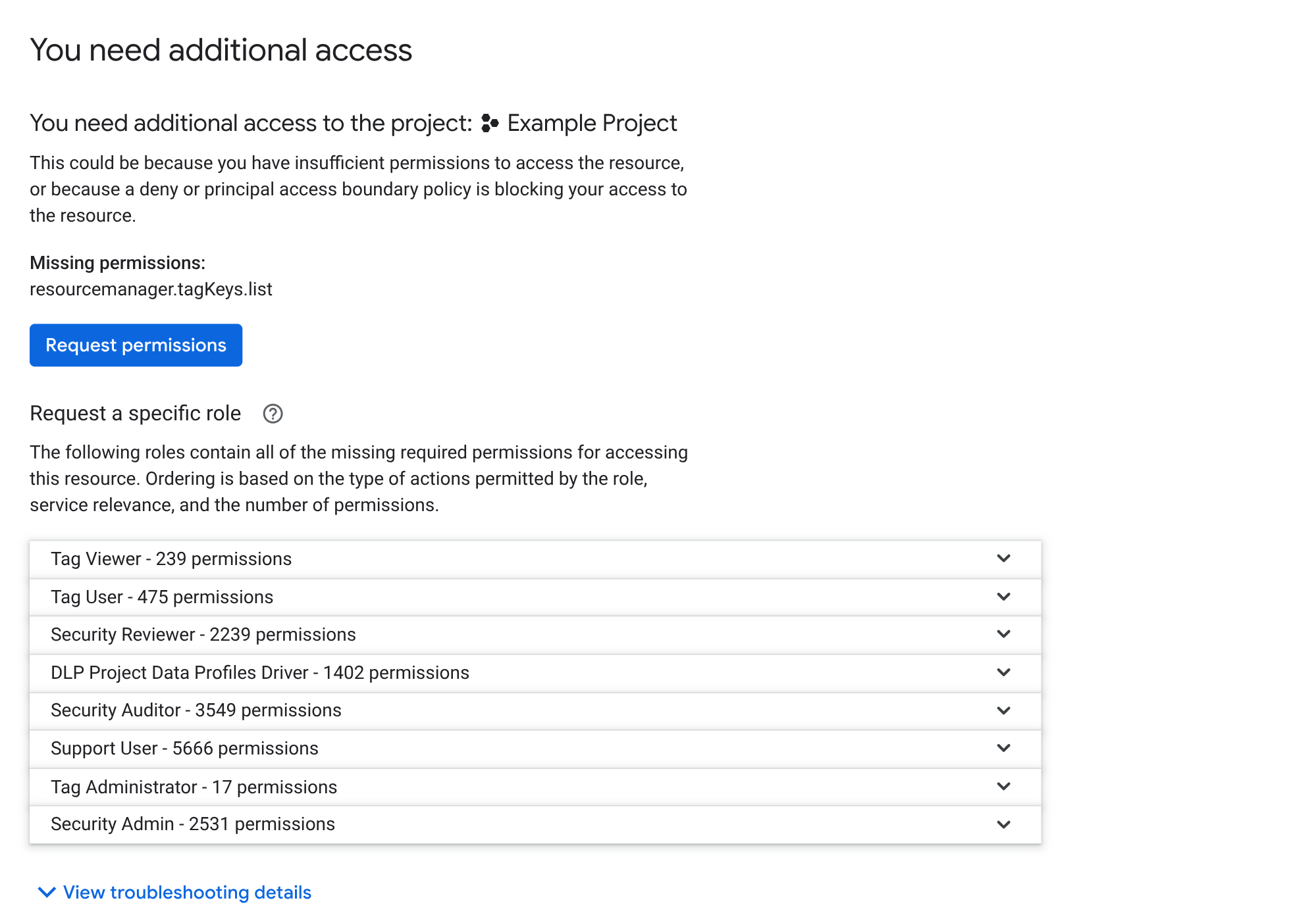 Trusted Cloud 콘솔을 사용하고 역할을 부여하는 데 필요한 권한이 있는 경우 요청하는 대신 오류 메시지에서 직접 역할을 부여할 수 있습니다. 자세한 내용은 Trusted Cloud 콘솔에서 역할 자체 부여를 참고하세요.