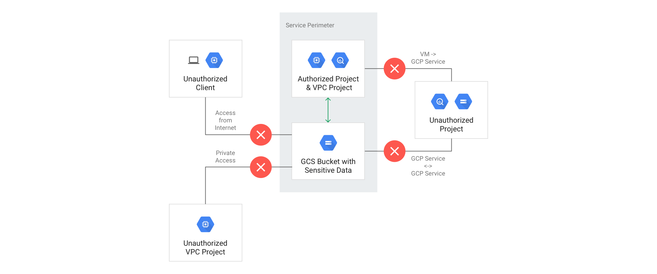 • Controles de Servicio de VPC no permite que una VM de una red de VPC que se encuentre dentro de un perímetro de servicio acceda a segmentos de Cloud Storage que estén fuera del perímetro.