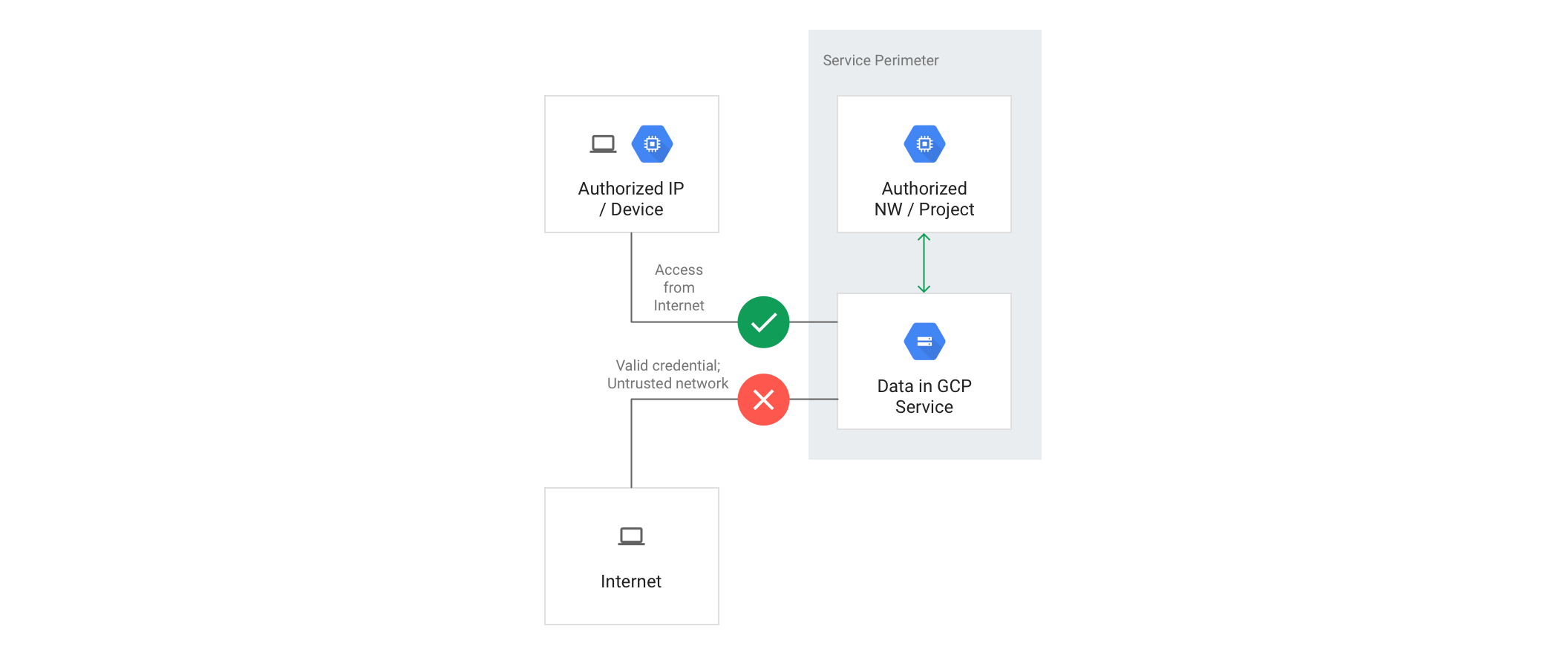 Los Controles de Servicio de VPC también impiden leer datos de un recurso que se encuentra fuera del perímetro o copiar datos en él. Controles de Servicio de VPC impide operaciones de servicio como el comando gcloud storage cp para copiar en un cubo de Cloud Storage público o el comando bq mk para copiar en una tabla de BigQuery externa permanente.