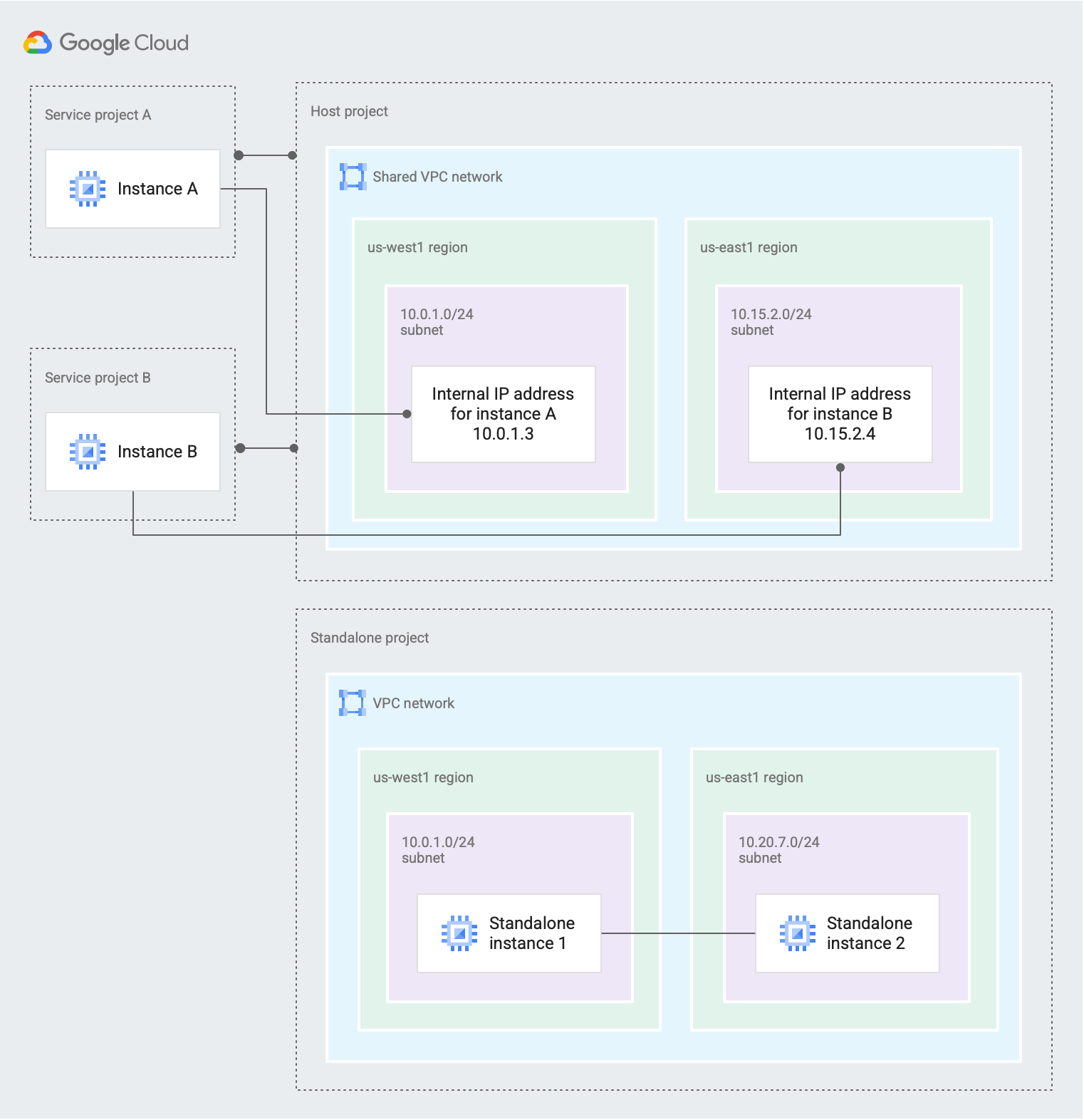 Direcciones IPv4 externas estáticas: los objetos de dirección IPv4 externa definidos en el proyecto host pueden usarse en los recursos de ese proyecto host o en cualquier proyecto de servicio adjunto. Los proyectos de servicio también pueden usar sus propios objetos de dirección IPv4 externa. Por ejemplo, una instancia de un proyecto de servicio puede usar una dirección IPv4 externa regional definida en su proyecto de servicio o en el proyecto host.