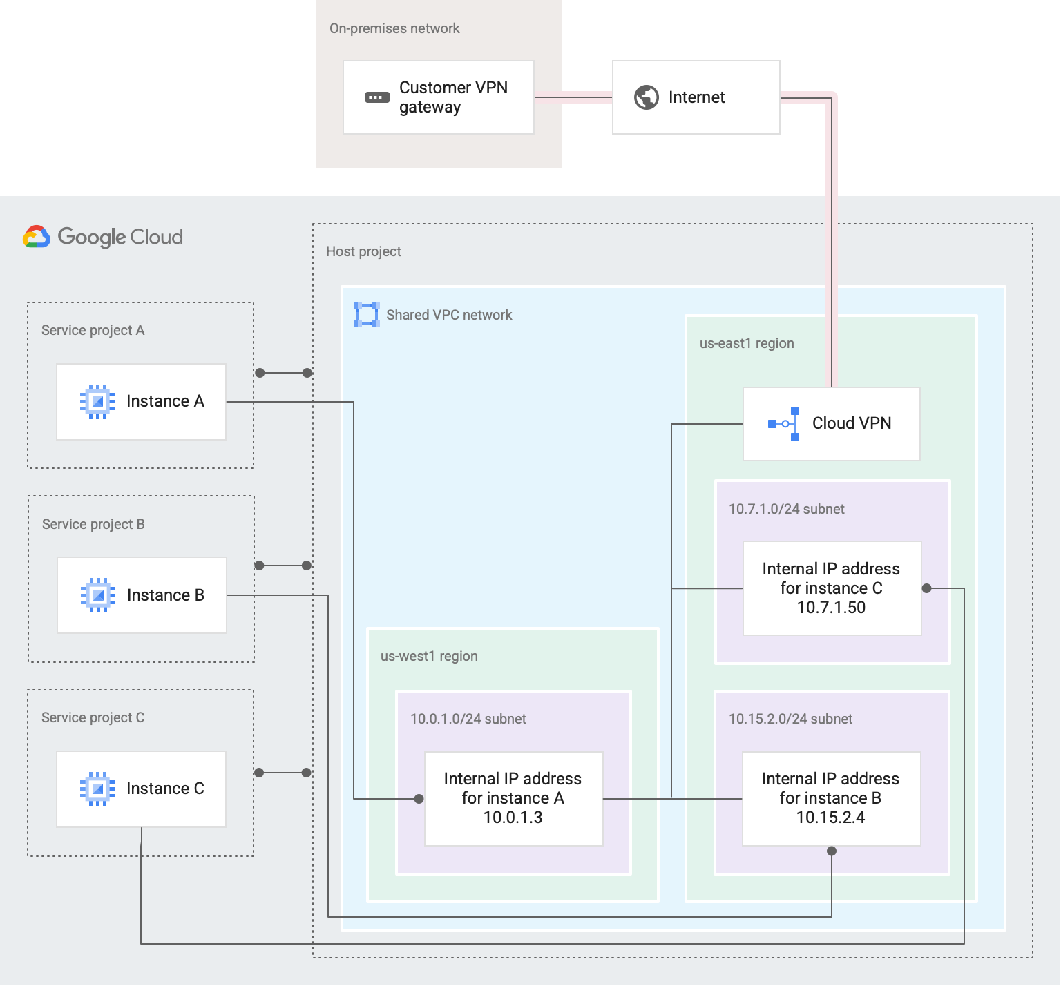 Imagen 3. Una red de VPC compartida está conectada a una red local y a tres proyectos de servicio (haz clic en la imagen para ampliarla).