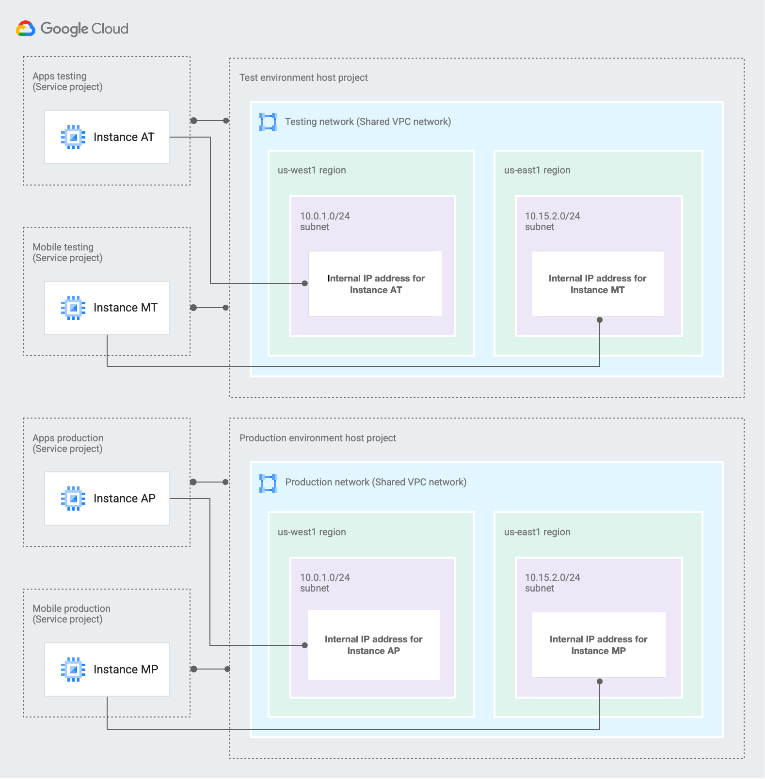 . Esto es aceptable porque cada instancia se encuentra en un proyecto de servicio asociado a un proyecto del host único que contiene su propia red de VPC compartida. Las redes de prueba y de producción se han configurado de forma intencionada de la misma manera.Las instancias que usen