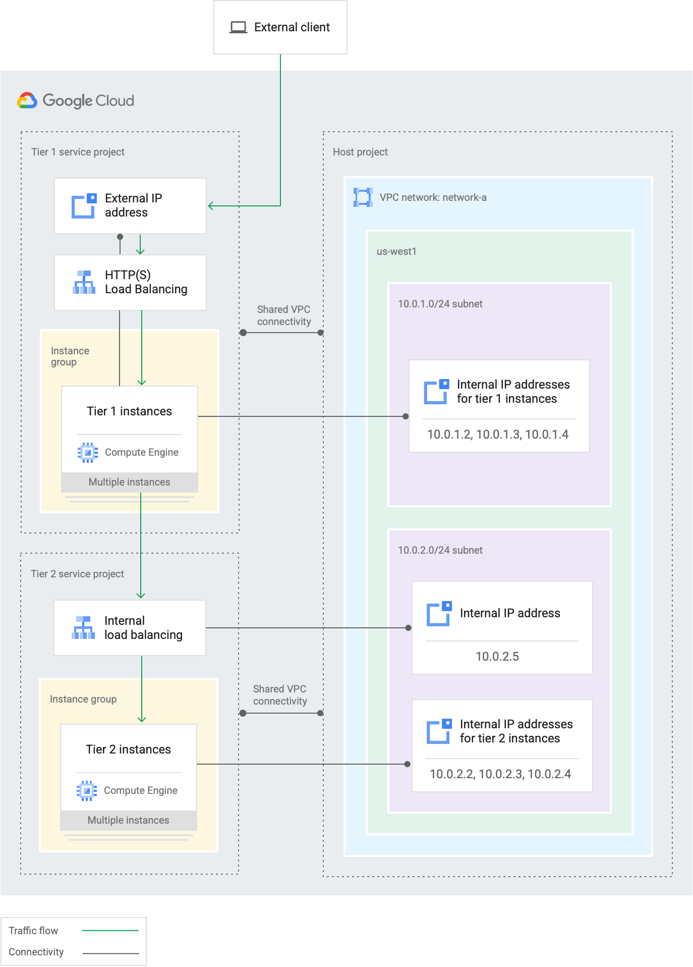 en esa subred junto con un balanceador de carga interno cuya regla de reenvío usa una dirección IP del intervalo disponible en esa subred.Los principales de gestión de identidades y accesos que supervisan todo el servicio web son administradores de proyectos de servicio en ambos proyectos de servicio y tienen permisos a nivel de proyecto en el proyecto host, por lo que pueden usar cualquier subred definida en él.